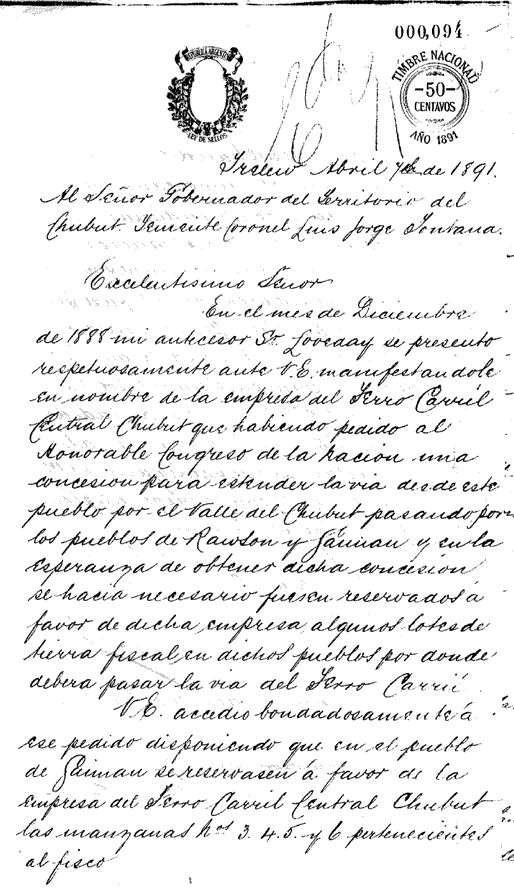 En el mes de Diciembre de 1888 mi antecesor Sr. Loveday se presento respetuosamente auta V.E. manifestandole en nombre de la empresa del Ferro Carril Central Chubut que habiendo pedido al Honorable Congreso de la Nacion una concesion para estender la via desde este pueblo por el valle del Chubut pasando por los pueblos de Rawson y Gaiman y cu la esperanza de obtener dicha concesion se hacia necesario fuesen reservados a favor de dicha empresa algunos lotes de tierra fiscal en dichos pueblos por donde debera pasar la via del Ferro Carril.