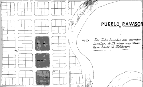 La Compania del FerroCarril Central del Chubut ante V.E. con el debido respecto se presenta y espone que este Ferrocarril ha petida al Honorable Congreso de la Nacion una concesion para estender la via desde este punto por el valle del Chubut pasando por el pueblo deRawson y con la esperanza de obtener dicha concesion en el año proximo pide a V.E. se srva ordenar la transferencia a este Ferrocarril o si no reserva los lotes siguientes de terreno numeros 169, 182, 193 que se necesitan para la Estacion y los edificios correspondientes marcados en el plano adjunto.