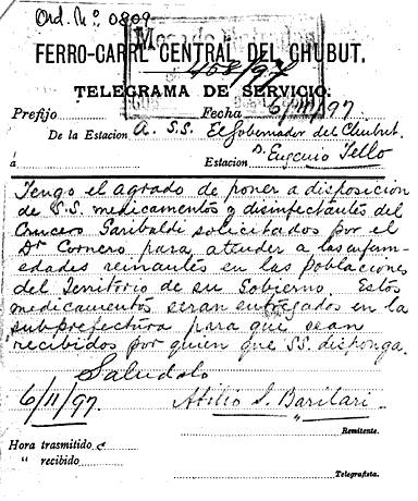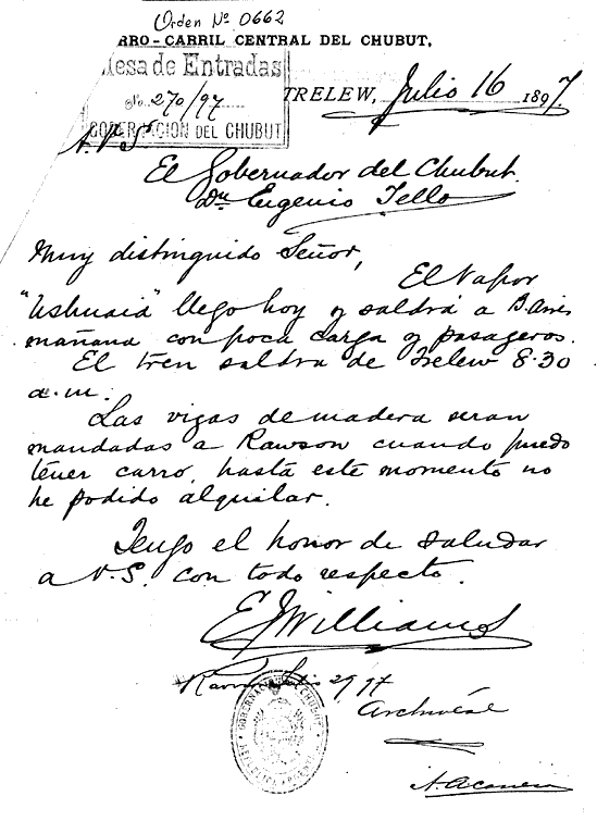 Appendix 3 Typical FCCC letters, telegrams and invoices A Letter of 1897 on various mundane matters FERRO-CARRIL CENTRAL DEL CHUBUT Trelew Julio 16 1897 Muy Distinguido Señor El Vapor 'Ushuaia' llego hoy y saldra a B. Aires mañana con poca carga y pasajeros. E Williams Trelew 16 July 1897 Most Distinguished Sir The steamer "Ushuaia" arrived today and leaves tomorrow with little cargo and few passengers. E Williams (signed) (Office Footnote) DES Note V.S. = Vuestra SeñorYa. It should not be taken that this form of address implies that he was a member of the nobility. It is merely the flowery language used. The nobility in Argentina was abolished at independence. B Telegram re medicines from the cruiser 'Garibaldi' FERRO-CARRL CENTRAL DEL CHUBUT Prefijo . . . No . . . Fecha 6/11/97 Tengo el agrado de poner a disposicion de S.S. medicamientos y disinfectantes del Crucero Garibaldi solicitados por el Dr. Cornero para atender a las enferedades reinantes en las poblaciones del Territorio de su Gobierno. Estos medicamentos seran entregadas en la subprefectura para que sean recibidos por quien que S.S. disponga Saludolo Atilio S. Barilari To S. S. The Governor of Chubut I have the pleasure of putting at the disposal of Your Lordship medicines and disinfectants from the cruiser 'Garibaldi' requested by Dr Cornero for the treatment of the sick reinantes in the towns in your territory. These medicines are stored in the coast guard station to await collection by whomsoever Your Lordship appoints. I greet you Atilio S. Barilari DES Note The surname sounds as though it has its origins in the Italian language. C Two invoices from 1910 & 1912 FERRO-CARRIL CENTRAL DEL CHUBUT Estacion, Gaiman 5/12 1912 Señor Miguel Mulhall Debe a Flete de Carga del vapor 12 tambores Naptha 4800kgs @ 8.80 = 42.20 $65.45 S. C. u O.
