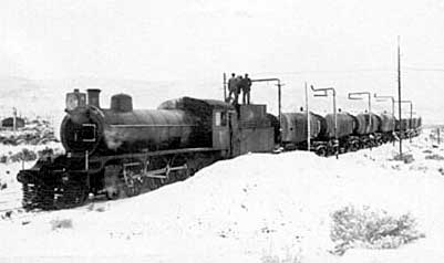 Eventually short branches were built from Km. 8, Empalme Astra, to access the oilfields at Astra and at Comferpet. The latter name is an abbreviation of the developing company 'COMpanía FERrocarrilera y PETroleo'. A large scale map of Comodoro Rivadavia is in an appendix page. A pacific, the mainstay of the line's power, waits at Astra for a train of oil tanks to be loaded. Judging by the men on the tender top it appears that the loco is also taking on fuel.