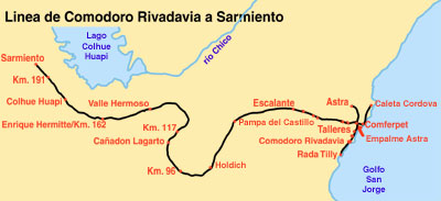The oilfields line Construction and opening At the beginning of the 20th century there had been no settlement at all at the coast, though Commodore Martín Rivadavia had anchored there in 1890 to explore the area. It was the agriculture of Colonia Sarmiento and the area around the lakes which required a small port and warehouses to aid the movement of produce to the north. By 1901 the first buildings had been erected and a proposal had been aired for a railway line from Rada Tilly (south of Comodoro Rivadavia) via Colonia Sarmiento to Colonia San Martín. Whilst Arturo Calman had obtained authorisation for this, it was never actually constructed (1). The town also received Afrikaaner migrants seeking a new start after the 'boer' republics were absorbed into the new Union of South Africa. In 1907 oil was discovered and the growth of the town was assured. A new railway route was surveyed in 1908 and was originally intended to form part of a single network with the other lines. Approval for the first 104km. from the coast was given on June 17 1910, at an anticipated cost of 25,300 gold pesos per km. The first materials reached Comodoro Rivadavia aboard the steamer Mendoza in April 1910 and gangs of Russians, Spaniards, Poles, Bulgarians, and others were set to work, presumably organised by languages for ease of command. The various laws and decrees which paved the way for the line to Colonia Sarmiento.