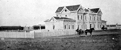 An early shot of the road side of Puerto Deseado station building. There are coaches to the left in the platform.