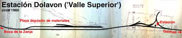 The extension to Playa Unión had no regular passenger service, this stopping at Rawson. However, there were weekend excursions to the beach and some of the trains illustrated above may have been on such duties. Branch Line to Rawson Muelle It started in 1932, but most of the action was in the second half of 1933. In January 1932, the Governor of the Territory of Chubut asked the FFCC del E head office in Buenos Aires to contribute towards the provision of a railway to serve the existing muelle near the mouth of the Río Chubut. The reply to this request was basically “no way”. In July of 1933 Buenos Aires Senior Management authorized the local manager at Puerto Madryn to build a branch line to serve the muelle. He met the Governor of the Territory, and agreement was reached to build the line. The District Engineer was given the job of designing and estimating it, which he did, and submitted his proposal to the Manager at Puerto Madryn, who proceeded to authorise him to get on with the work. He started work at the end of October. The proposal which had been accepted involved most the branch being laid along the carriageway of a road which the Territory had built in 1931 to give good access to the muelle. The carriageway was 7 m. wide, and the railway was to occupy 2 m., thus leaving 5 m. for traffic — quite inadequate for two way traffic! Work was ongoing on the formation of a transfer yard at the junction, and about a kilometre of track had been laid along the branch when the whistle was blown by the local Head of the National Roads Authority, who complained to the District Engineer at Comodoro Rivadavia about what was going on. It would appear that the complaint was relaid to Buenos Aires and the Audit Office investigated. The Audit Office acted at once by suspending all work on the branch beyond where the rails had reached, and diverting the labour force on to lifting the track already laid to final level in the yard and on the branch, while they investigated. The road was to be widened where the track had already been laid. Possibly this involved slewing the rails on to the verge. Apart from the unsatisfactory arrangements on the road, the terminal yard at the muelle would have been unworkable; there was no agreement as to ownership and use of the muelle; no agreement to take over or use the existing decauville track on the muelle; no agreement to transfer fiscal land to the railway had been made; there were no cost headings established to which the work could be charged (it had been charged to maintenance of the line). The Governor had made prisoners available to do some of the manual work; one wonders if there might not have been irregularities here as well. Audit Office concluded their letter by asking the General Management to consider whether the project should proceed, and if so, to have undertaken the necessary negotiations and allocate the necessary funds. We don't know what happened, though the evidence from station arrangement sketches in the 1950s is that it was not completed and that the track in the junction yard had been lifted. The extension westward toward Colonia 16 de Octubre The new alignment started from Dolavon, the FCCC's 1915 railhead. There were no serious difficulties along the route, though steeper gradients west of Boca de la Zanja meant some wide sweeping curves to gain height. The layout of Dolavon at the closure in 1961 is easy to reconcile with the photo below. However, it was taken from a Chubut cadastral survey dept. plan, and track accuracy will not have been their primary concern. In any case I suspect that the loops in front of the station building may have been taken out later on.