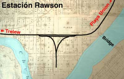 The branch to Rawson & Playa Union The track runs through Rawson close to the river and past the north end of the road bridge. The bridge continues to carry traffic to this day.