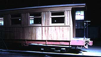 A second class car constructed on a 1922 wagon frame. Note that this vehicle effectively has no doors, and relies on its neighbours to provide means of boarding and alighting.