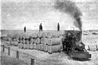 The photos above and below show a locomotive (probably Hanomag no. 4567 illustrated further down) with the bales of wool which were the main cargo from the estancia to the port. The one above was taken at the estancia outside the woolstore which still exists, though nowadays facing the main Ruta Nacional. The picture below was kindly provided by Carlos Vairo of Ushuaia Maritime Museum.