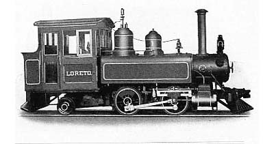 There are a number of items of interest here. Coal traffic has increased to over 33,000 tonnes. The loco mileage, (allowing for light engine workings to the maestranza at the half way point) equates to about 700 round trips per year, or two round trips per day in a seven day week. This also suggests that the average downhill loading of coal was less than fifty tonnes per trip. The US report on the other hand states that there were four trips per day carrying 121 tons (each?). A study of the figures forwarded to the government each year is revealing. The railway's staffing seems to vary considerably – between 8 and 39, and even up to 96 in one exceptional year; perhaps someone misread the figures? There also seem to have been a number of minor accidents – 10 derailments for example in 1924 and in 1927, and one railway staff member killed in a derailment in 1922. In most years the railway seems to have made a modest profit though there were exceptional costs in 1916 and 1923 of an unknown nature. Coal production must have increased even further during the Second World War when good quality European coal was impossible to come by. In the Isla Riesco and Peninsula Brunswick area overall, production almost trebled by 1943. However, oil was increasingly taking away coal's markets and after the war the end came swiftly. The railway was first cut short to the Talca/Colon junction and then right back to the maestranza. By 1950 both it and the mine had closed. Locomotives and stock The new 1902 railway purchased 0-4-2Ts from the Baldwin Locomotive Works. The first arrived in January 1902 just as the new track was completed. Some reports suggest that two were in operation later that year. On the other hand other reports from the early years state that the railway had one loco along with one coach and 23 wagons (12). The BLW erecting drawings catalogue of the DeGolyer Library lists the 1901 loco illustrated below as the line's no. 1, whilst a later 1906 loco is shown as line no. 2. One of the line's first locos is shown here in a sketch from a later BLW catalogue. This was a small 0-4-2 side tank with 9 x 14 inch cylinders and weighing about 28,000lbs, of BLW's 6-11 1/3C class. This engine is clearly named 'Loreto' but if a second existed it has not yet been identified. One has been pinned down as class 6-11 1/3C no. 47, of 02/1901, - lignite fuel - metre gauge - Baldwin no. 18510, ordered by Agustin Ross (13).