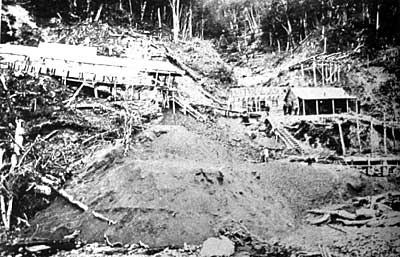 Whilst there is no sign of any railway in the above picture there were probably mine tubs used underground. The picture below, though taken later, shows a fairly primitive pair of wooden wagons on what looks like a rather narrower track than the one metre gauge of the eventual main railway. I believe such trucks eventually ran out from Mine 1 on the surface for a couple of hundred yards before reaching the big coal hopper over the later railway.