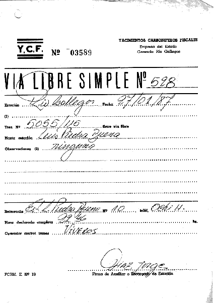 On the Río Turbio line the train weighbill doubled as a check on each of the events in a train's progress. On one side of the form (