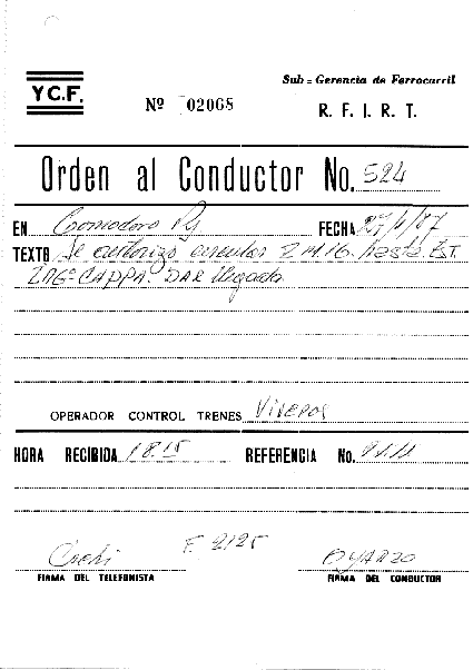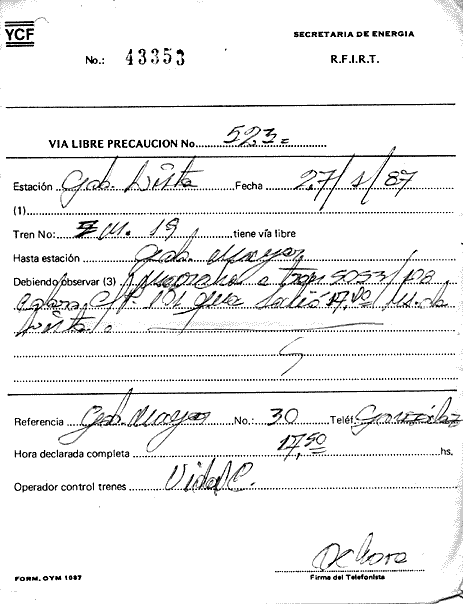 On the RFIRT this practice was known as the 'Vía Libre' system, equating to the phrase 'Line Clear' used in Britain. The sequence of conversations between the control office and a station assistant to complete the necessary forms was laid down in the rulebook in great detail (1). Below are samples of the train orders and weighbills used on the Río Turbio line, at least until recently.