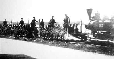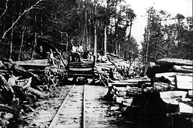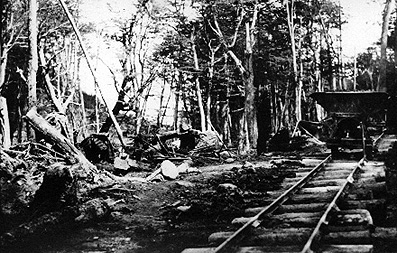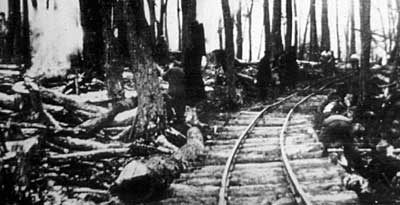 The way through the woods. Although the picture is unclear a couple of men can be made out and a bonfire on the left. The sleepers appear to be just round tree trunks unsawn.