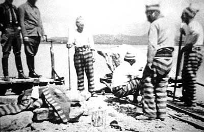Prisoners at work on the muelle. A couple of skip chassis, probably used to bring in the stone, are in the background.