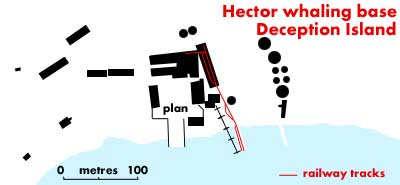 Deception Island, South Shetland Islands This is close to the Antarctic Peninsula. It had a whaling station known as the Hector station after its operator A/S Hector of Tonsberg, Norway. It was in operation from 1912 to 1931. Whilst the only photo so far seen of Deception Island in operation does not permit any railway lines to be distinguished (13), plans of the site show that there was a small hand-worked rail network (14). This ran from a double-tracked jetty directly inland with a halfway passing loop, to finish as sidings within a couple of buildings. A picture from 1926 in the care of the Scott Polar Research Institute apparently also shows inclined tracks leading up to the top of the blubber boilers.