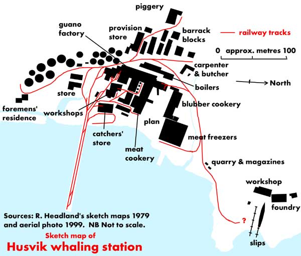 Husvik 1907-61 This also has track still in place. Another of Jim McLaren's photos, below, shows lines along the jetty, as seen from a vessel alongside. It was at this station that Professor Smith's informant, Robert Headland of the British Antarctic Survey, reported seeing something looking very like an engine shed. The station was operated by the Tonsberg Whaling Co., a Norwegian concern like many in the industry.